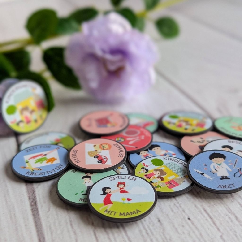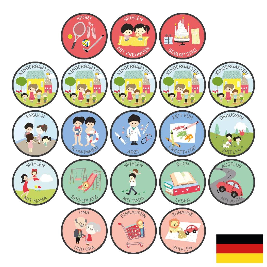 🇩🇪 German version • 5x Kindergarten • Spielen mit freunden • Arzt • Schwimmen • Zeit für kreativität • Ausflug mit auto • Draussen spielen • Spielen mit mama • Spielen mit papa • Buch lesen • Besuch • Geburtstag • Spielplatz • Sport • Einkaufen • Oma und opa • Zuhause spielen