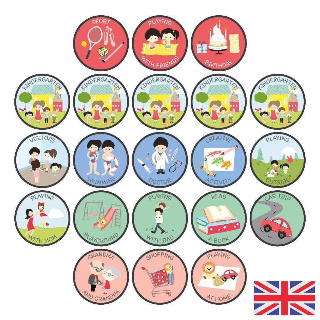 🇬🇧 English version • 5x Kindergarten • Car trip • Grandma and grandpa • Playing at home • Playing outside • Sports • Visitors • Playing with friends • Playground • Reading • Playing with mom • Doctor • Shopping • Creative activity • Swimming • Birthday • Playing with dad