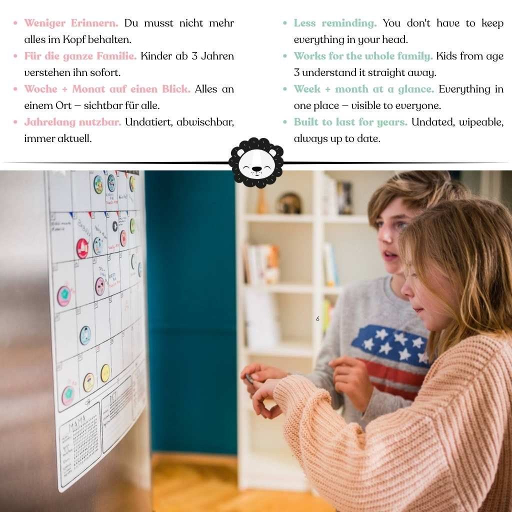“Do we have practice today?” “When is grandma coming?” “What’s happening tomorrow?” — and somehow you’re always the one with the answer. This magnetic family calendar hangs where everyone can see it and shows at a glance what’s happening this week and this month. Less asking, less repeating, less reminding everyone five times. Kids aged 3+ understand it straight away — and suddenly start checking it all by themselves.