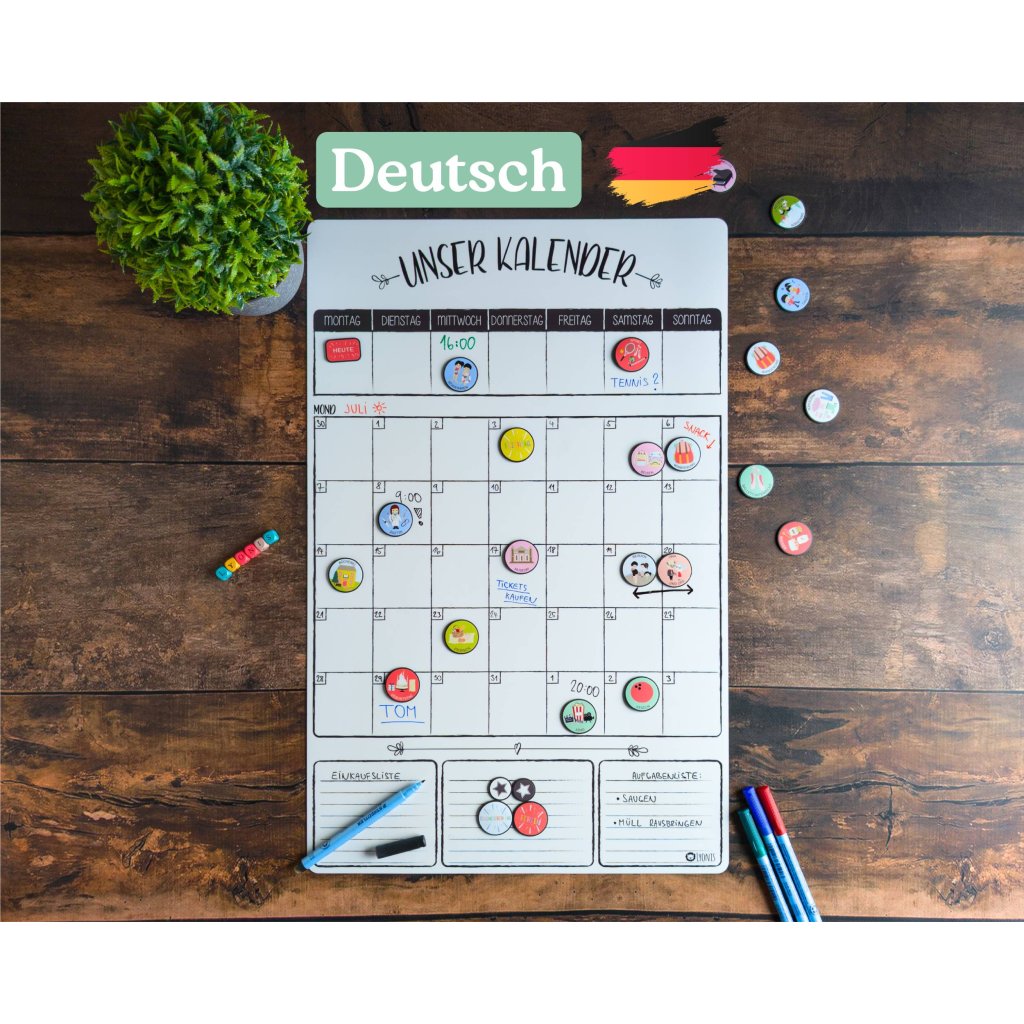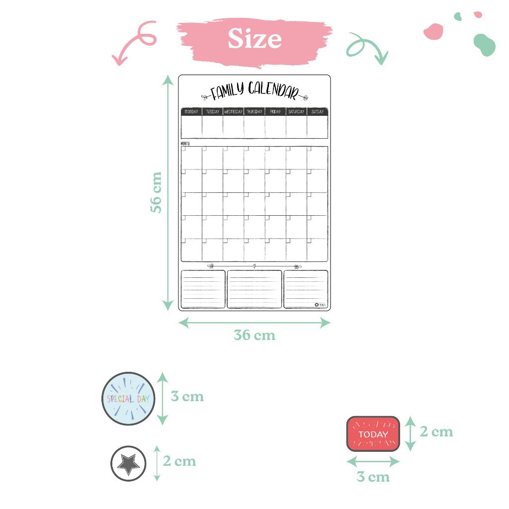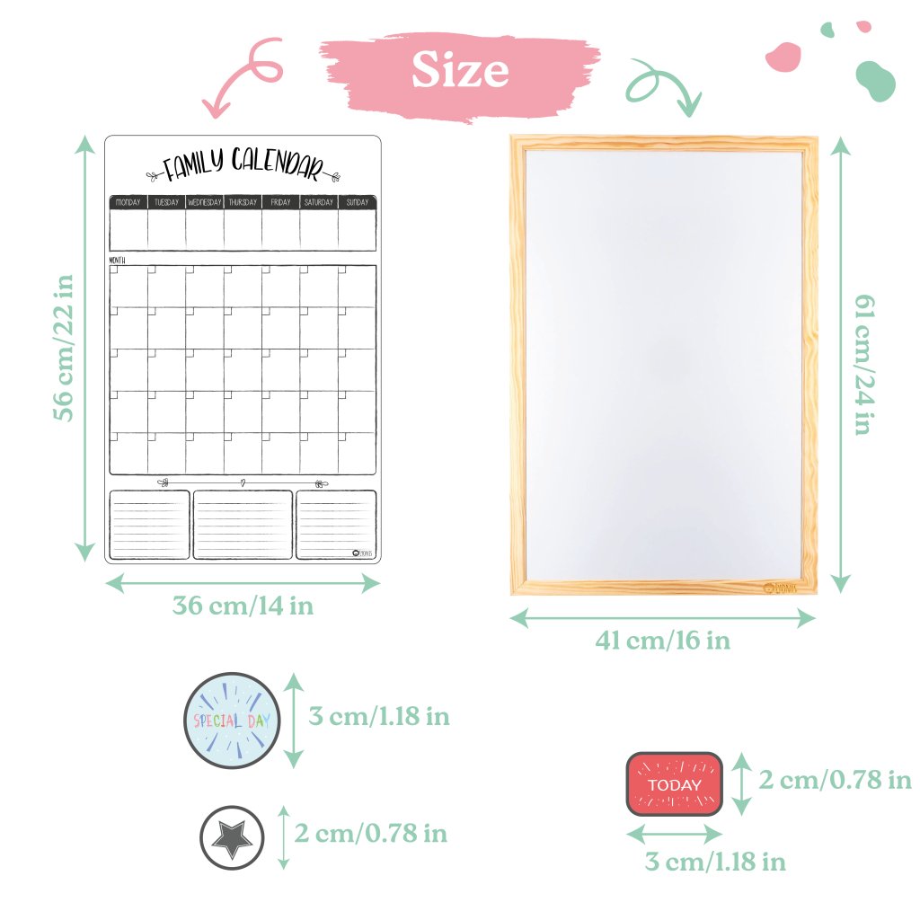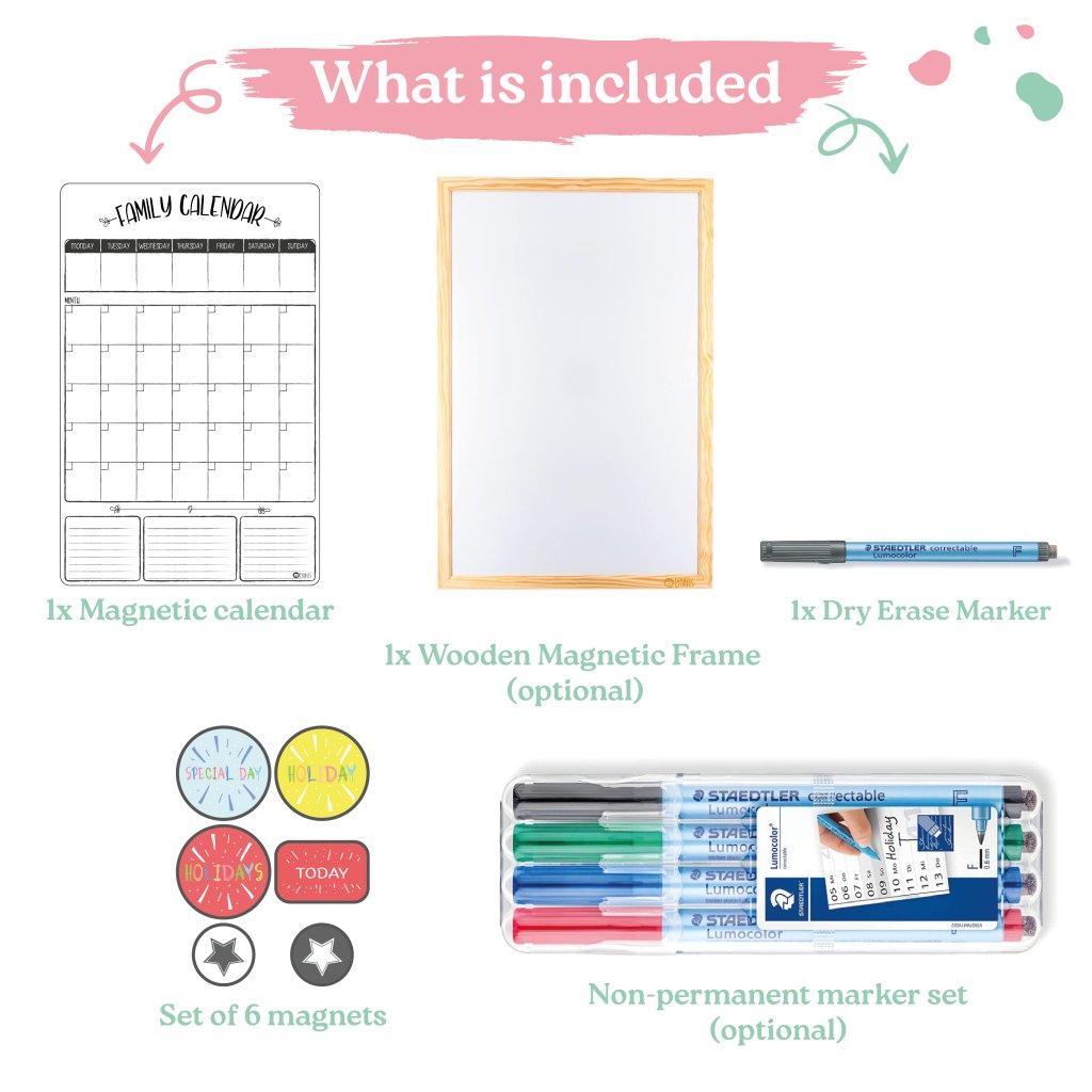 PACKAGE INCLUDES: 1x flexible magnetic calendar (approx. 56x36 cm), 4 pcs of magnets - holidays, special day, holiday and today, and as a gift one black Steadtler marker. You can place the magnetic calendar directly in the center of action - on the refrigerator or on any other surface where magnets hold. For example, on our magnetic board in a wooden frame or self-adhesive magnetic board. (Board/Frame are not included in the package)