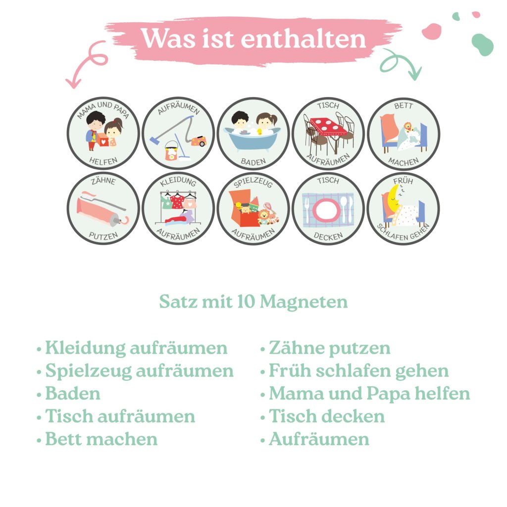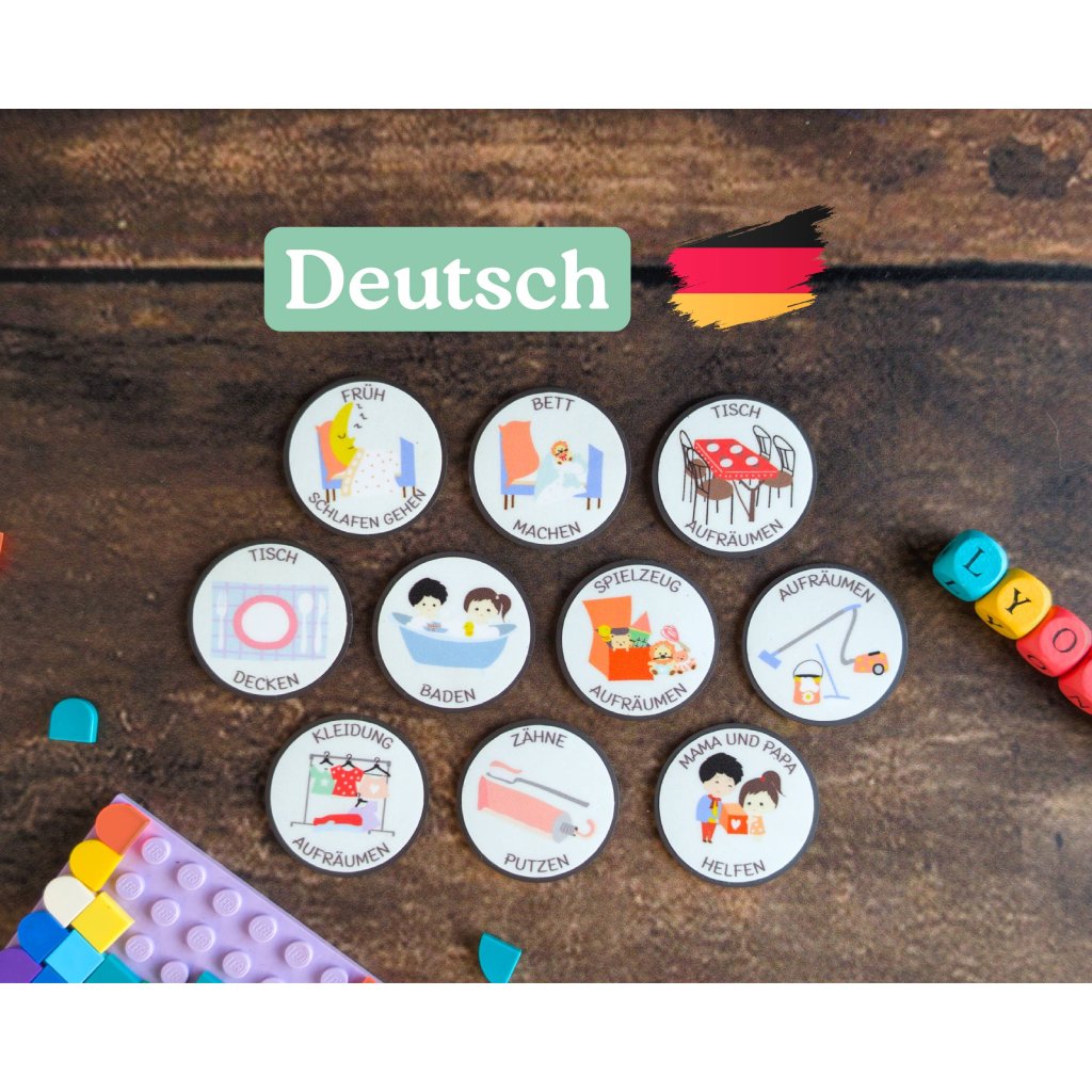 🇩🇪 German version • Kleidung aufräumen • Spielzeug aufräumen • Baden • Tisch aufräumen • Bett machen • Zähne putzen • Früh schlafen gehen • Mama und Papa helfen • Tisch decken • Aufräumen