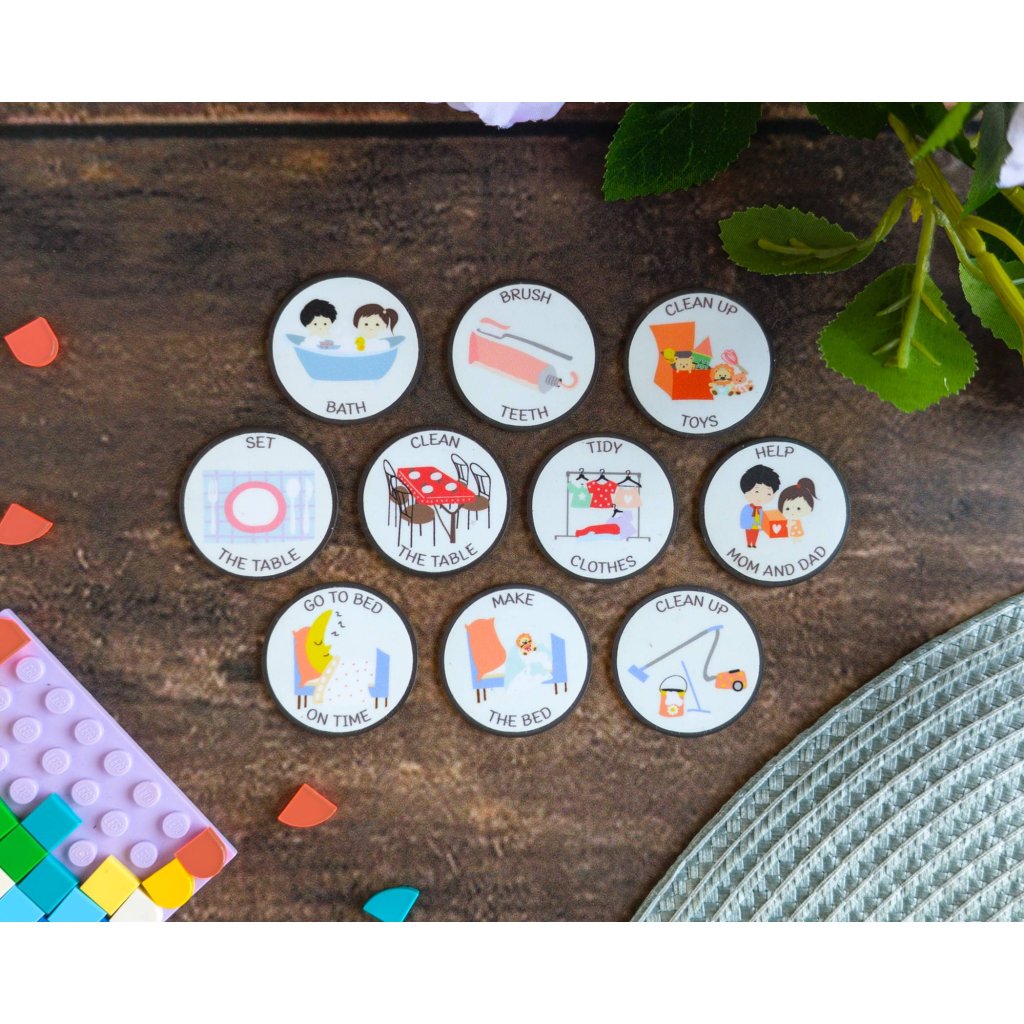 🇬🇧 English version • Tidy clothes • Clean up toys • Bath • Clean the table • Make the bed • Brush teeth • Go to bed on time • Help mom and dad • Set the table • Clean up