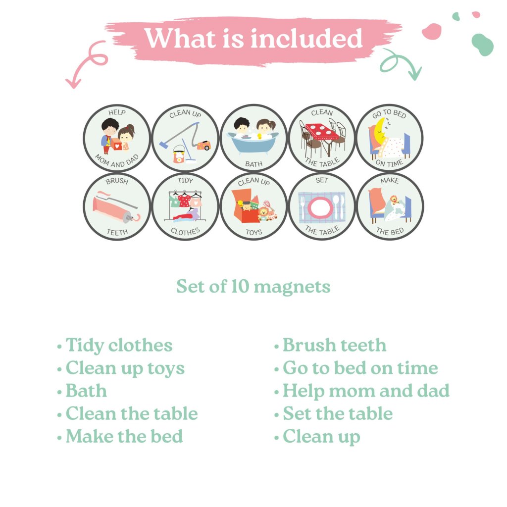 With this set of chore magnets designed for kindergarten-age children, household responsibilities become a natural part of your child's daily routine – without the need for constant reminders. Watch as daily tasks transform from resistance into proud independence. It's never too early to start.