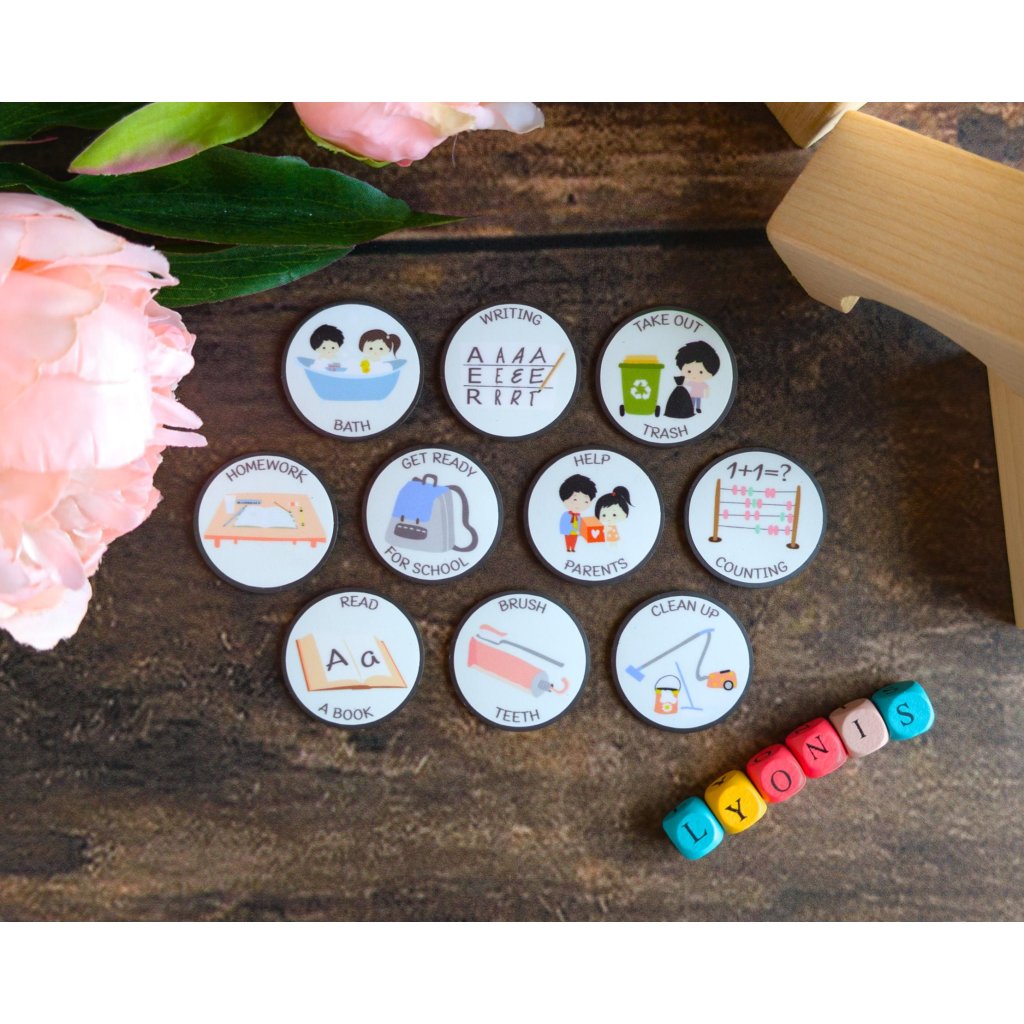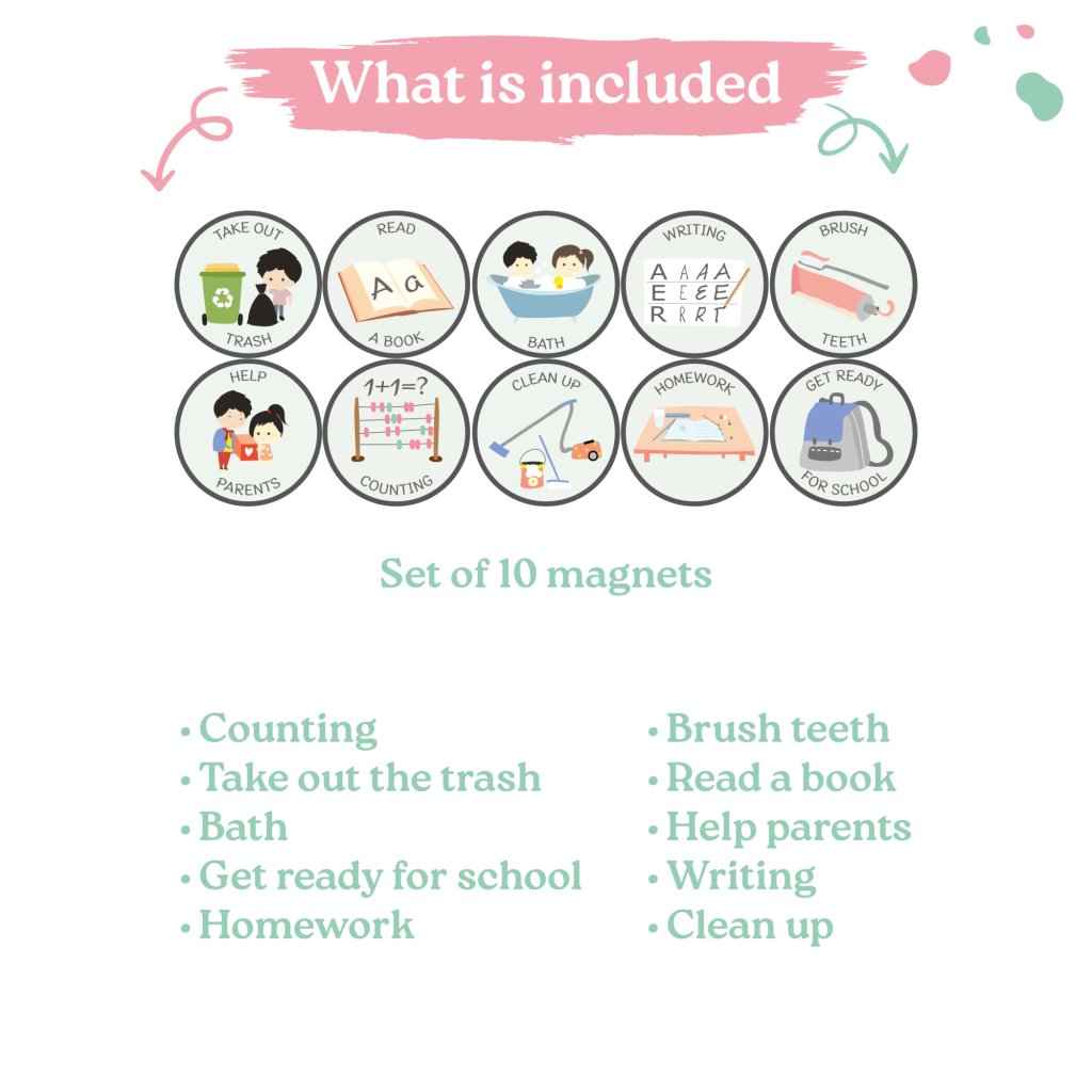 Far less repeating the same things over and over: "Brush your teeth, do your homework, clean your room!" With this magnet set, you'll start experiencing much calmer days and actually enjoy them together. These magnets are the perfect companion to your weekly planner – helping kids see what needs doing and take charge themselves.