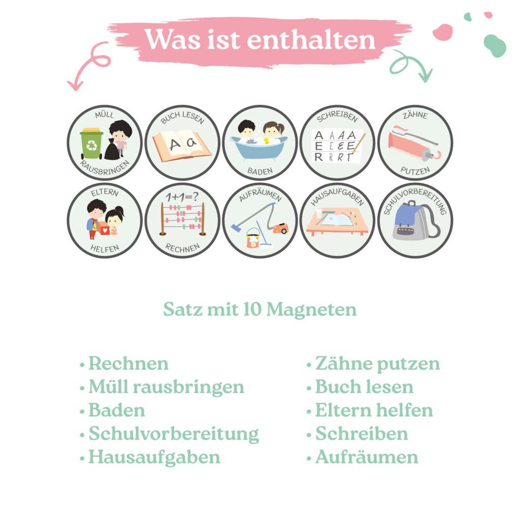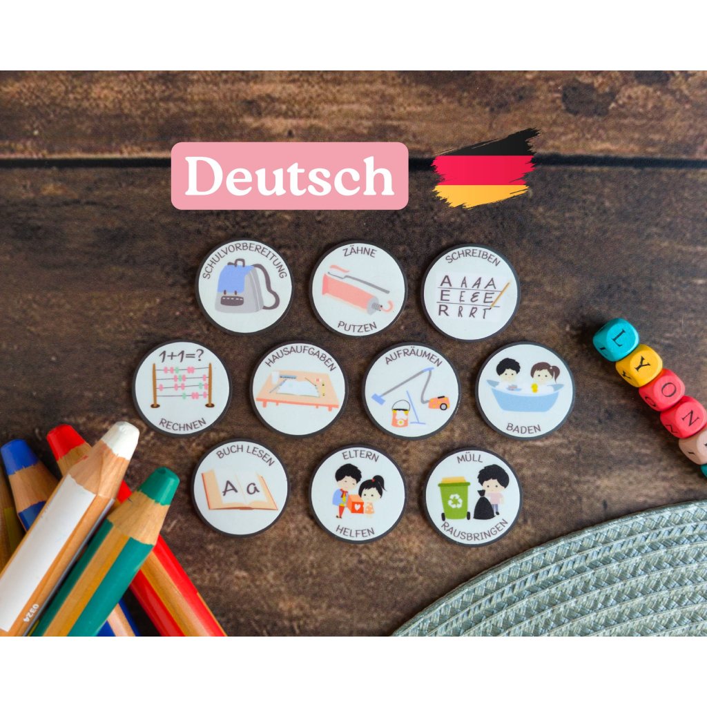 🇩🇪 German version • Rechnen • Müll rausbringen • Baden • Schulvorbereitung • Hausaufgaben • Zähne putzen • Buch lesen • Eltern helfen • Schreiben • Aufräumen