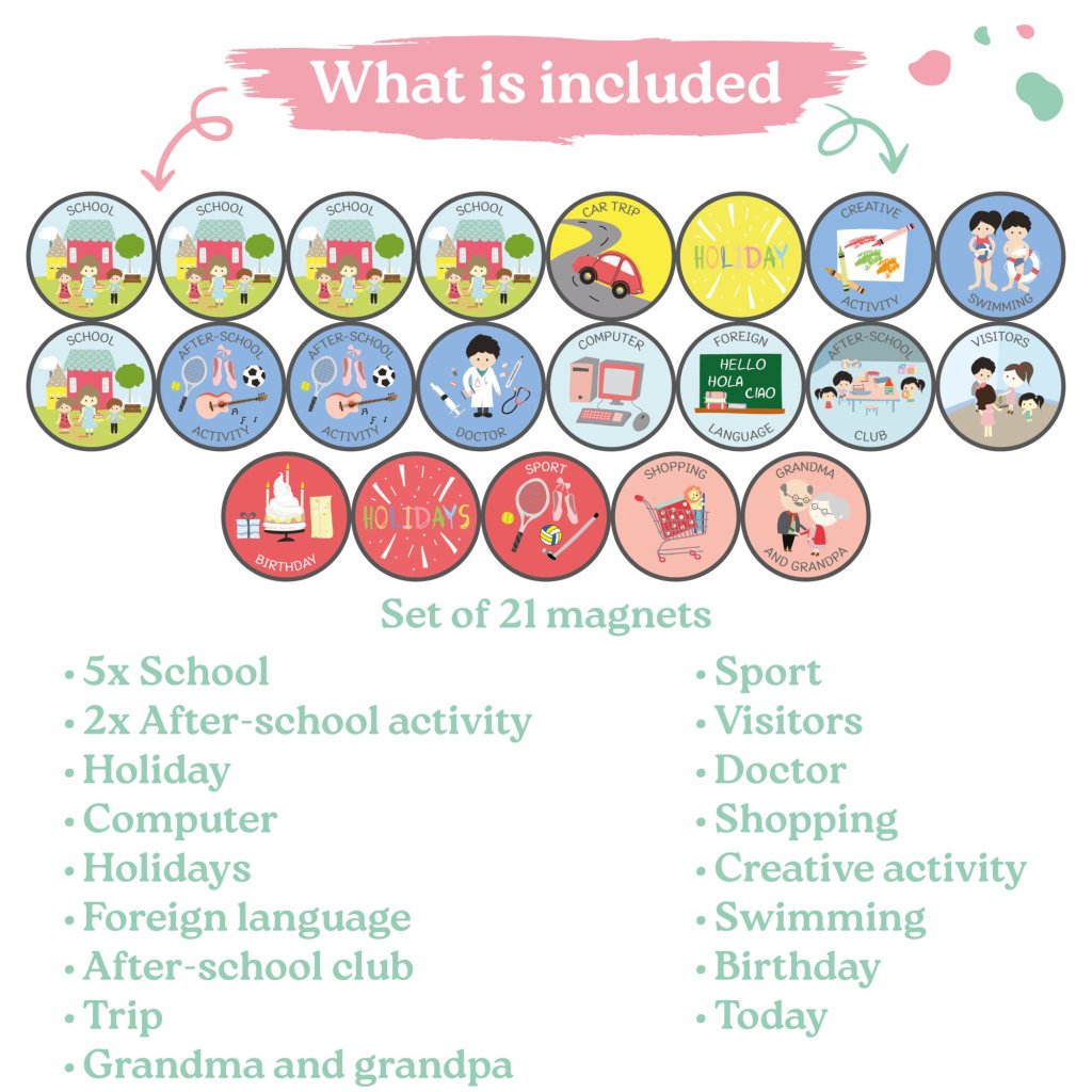 Mom, when do I have swimming again?" Familiar? School life means plans, clubs, and special events – and it only gets busier. This magnet set gives your kids a visual tool to track it all themselves. Turn your planner into a clear school-week overview where everyone knows what's happening, when and without the constant reminding.