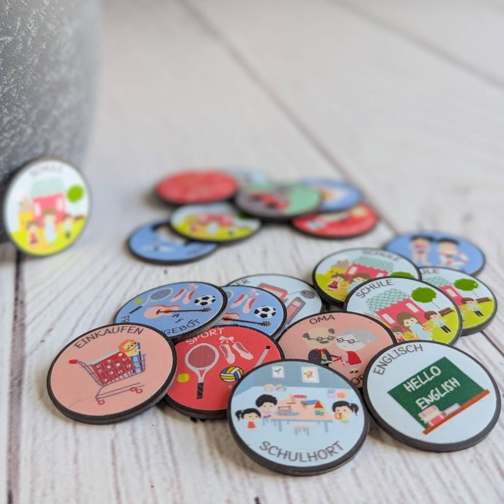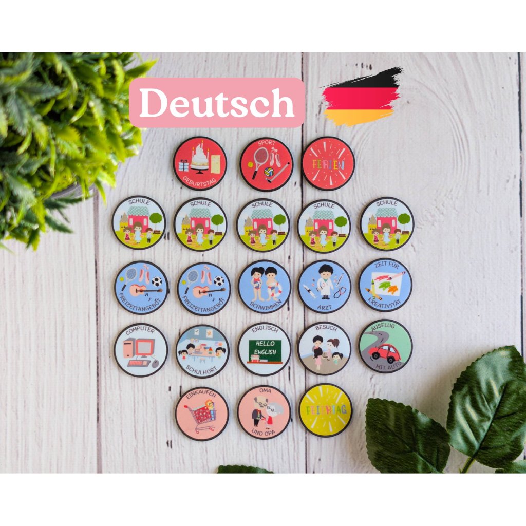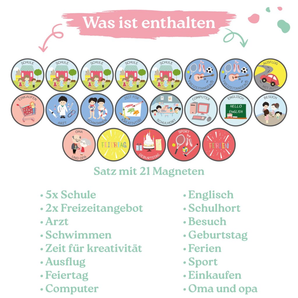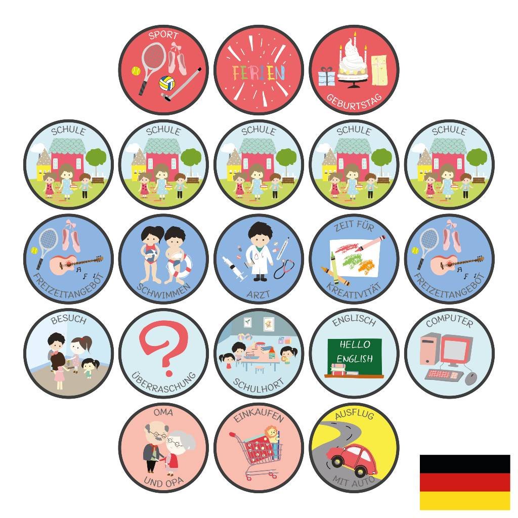 🇩🇪 German version • 5x Schule • 2x Freizeitangebot • Arzt • Schwimmen • Zeit für kreativität • Ausflug • Feiertag • Computer • Englisch • Schulhort • Besuch • Geburtstag • Ferien • Sport • Einkaufen • Oma und opa
