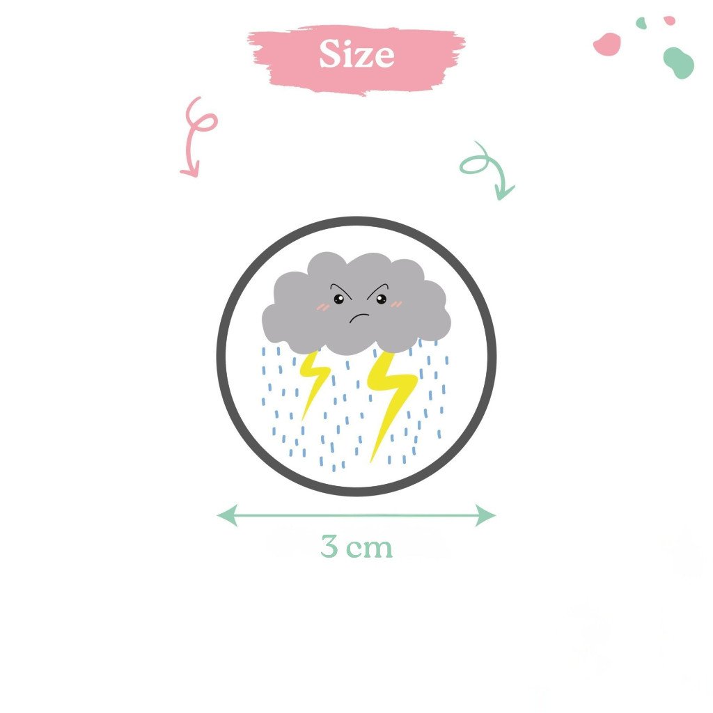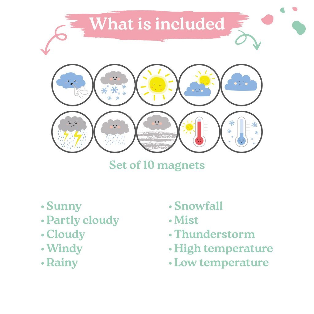 Magnet set includes: • Sunny • Partly cloudy • Cloudy • Windy • Rainy • Snowfall • Mist • Thunderstorm • High temperature • Low temperature